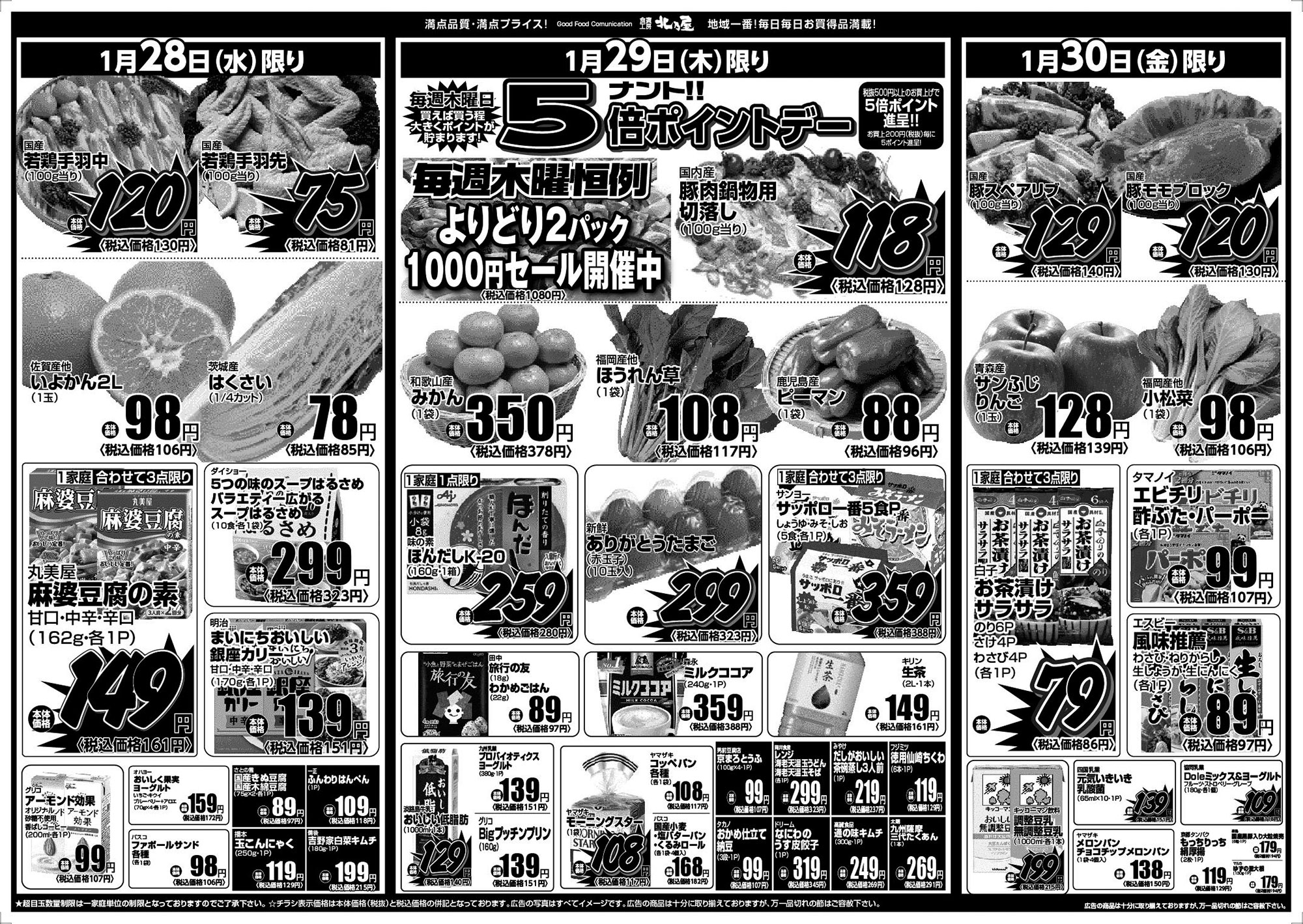 ★超目玉数量制限は一家庭単位の数量制限となっておりますのでご了承下さい。 ★チラシ表示価格は本体価格(税抜)と税込価格の併記となっております。 ★広告の写真はすべてイメージ図です。 ★広告の商品は十分に取り揃えておりますが、万一品切れの節はご容赦下さい。