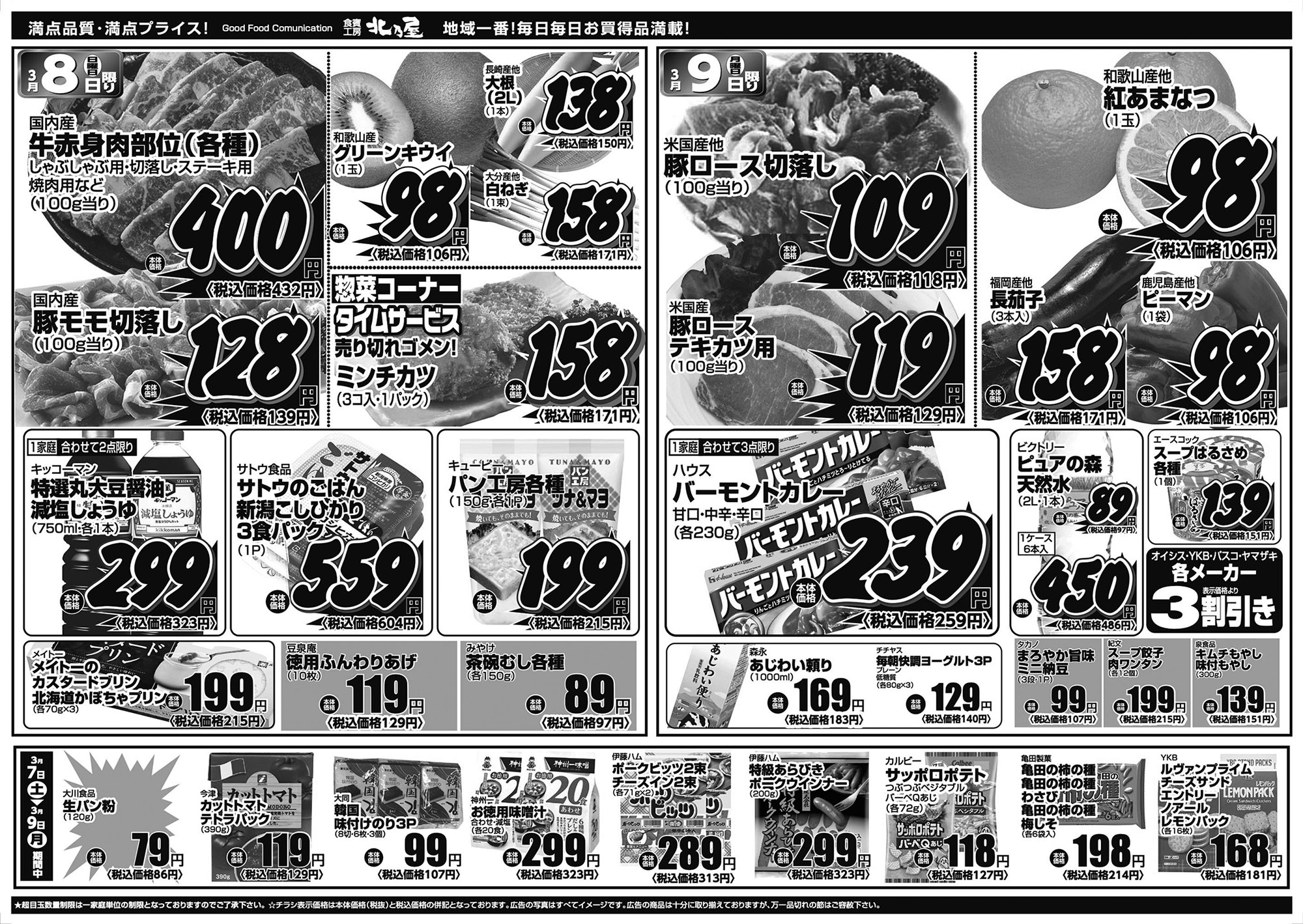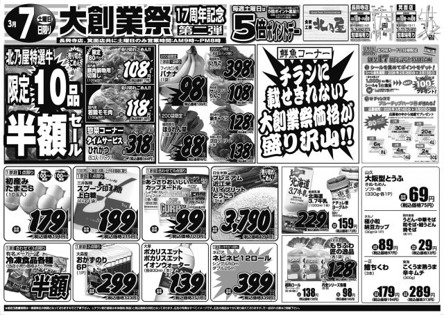 ★超目玉数量制限は一家庭単位の数量制限となっておりますのでご了承下さい。 ★チラシ表示価格は本体価格(税抜)と税込価格の併記となっております。 ★広告の写真はすべてイメージ図です。 ★広告の商品は十分に取り揃えておりますが、万一品切れの節はご容赦下さい。
