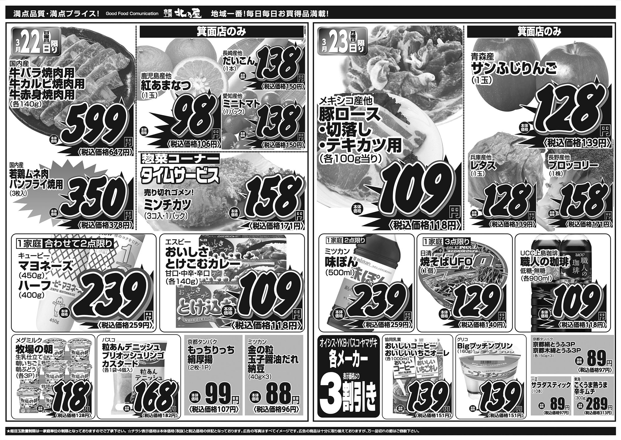 ★超目玉数量制限は一家庭単位の数量制限となっておりますのでご了承下さい。 ★チラシ表示価格は本体価格(税抜)と税込価格の併記となっております。 ★広告の写真はすべてイメージ図です。 ★広告の商品は十分に取り揃えておりますが、万一品切れの節はご容赦下さい。