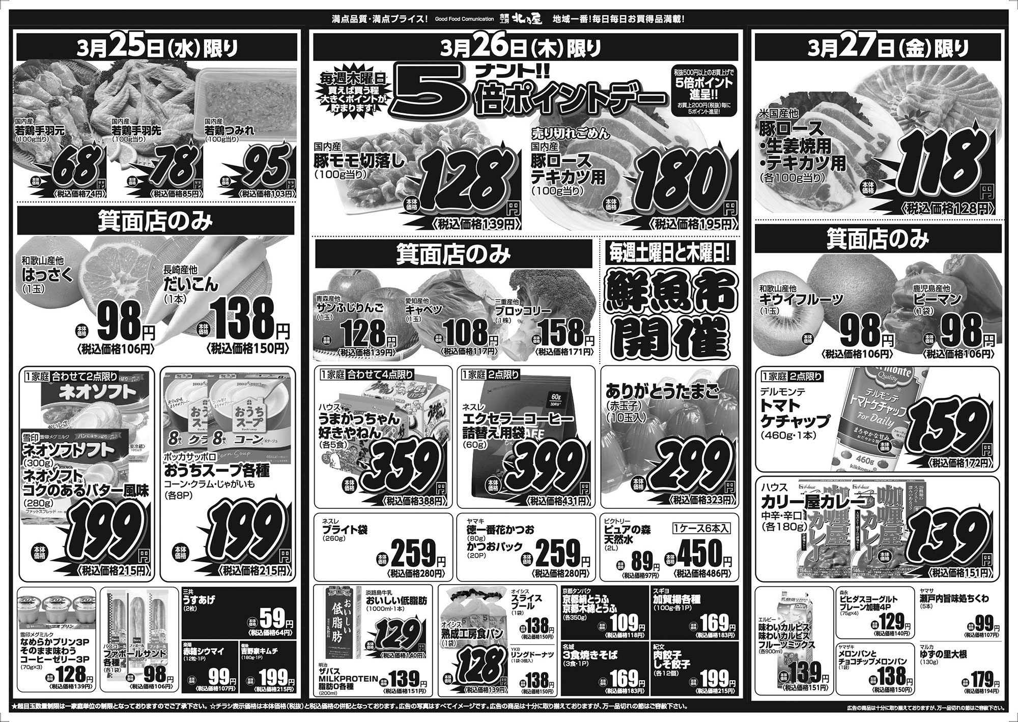 ★超目玉数量制限は一家庭単位の数量制限となっておりますのでご了承下さい。 ★チラシ表示価格は本体価格(税抜)と税込価格の併記となっております。 ★広告の写真はすべてイメージ図です。 ★広告の商品は十分に取り揃えておりますが、万一品切れの節はご容赦下さい。