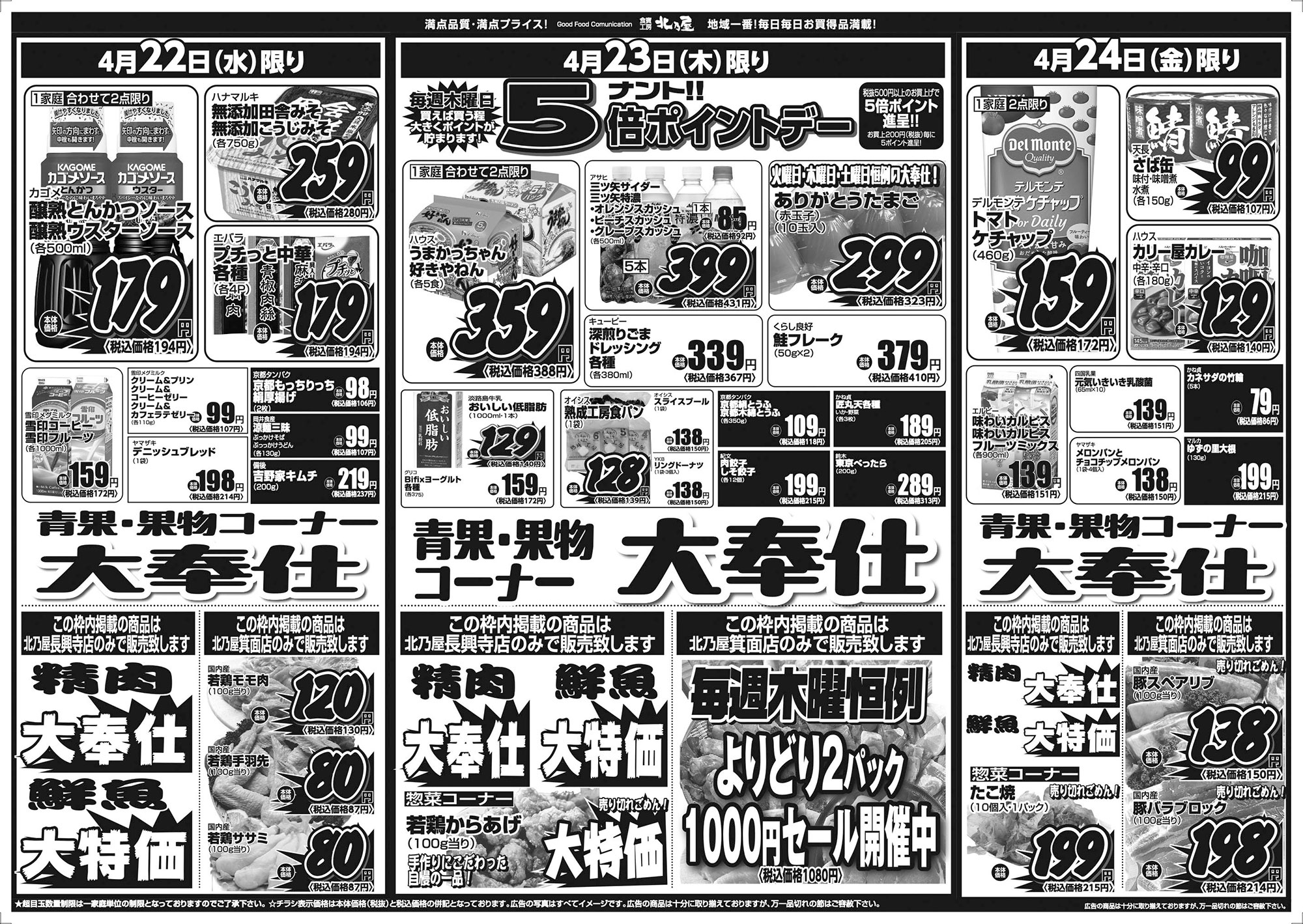 ★超目玉数量制限は一家庭単位の数量制限となっておりますのでご了承下さい。 ★チラシ表示価格は本体価格(税抜)と税込価格の併記となっております。 ★広告の写真はすべてイメージ図です。 ★広告の商品は十分に取り揃えておりますが、万一品切れの節はご容赦下さい。