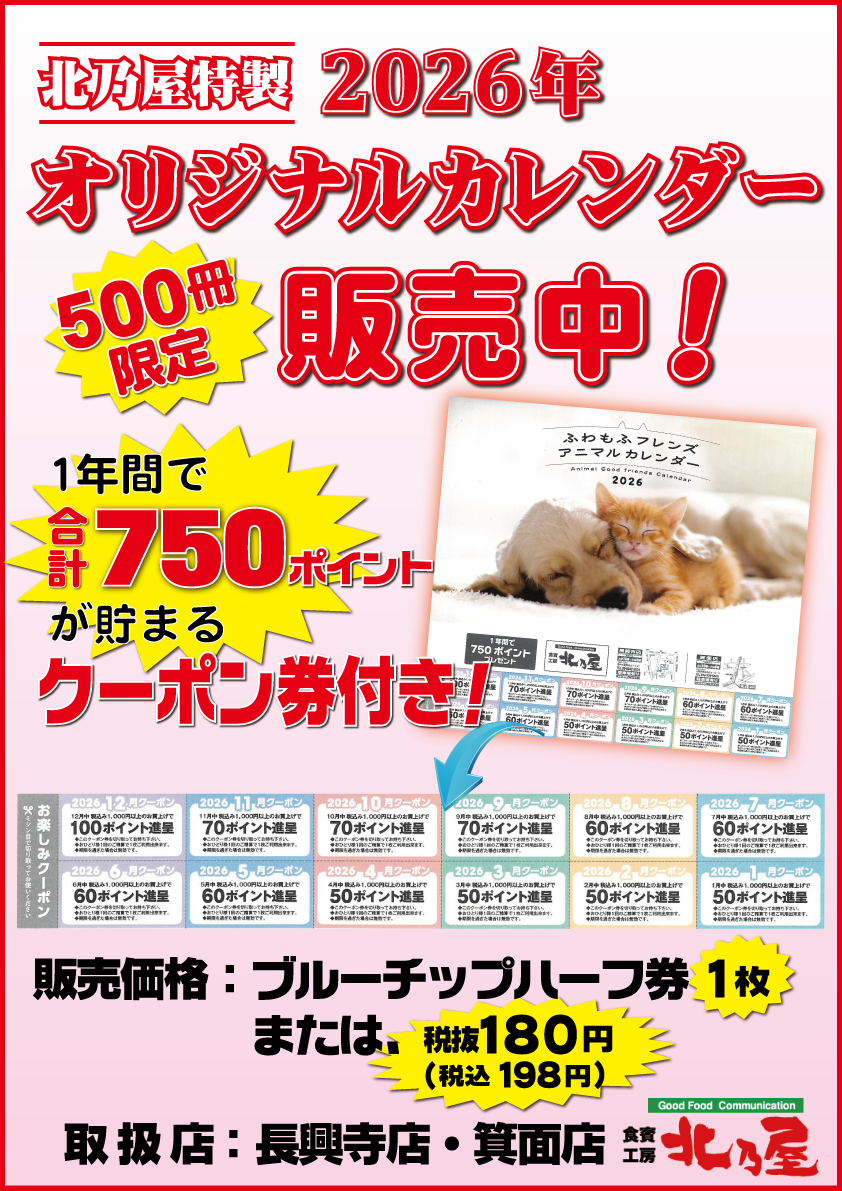 年末恒例の北乃屋特製「2026年オリジナルカレンダー」を販売中です!